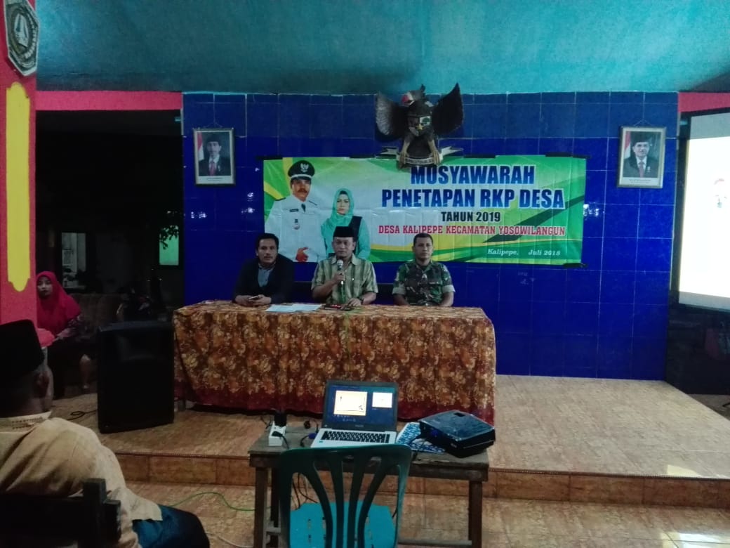 Dalam Rangka Penyusunan Rencana Pembangunan Desa Tahun anggaran 2019 Desa kalipepe Jumat ( 27/08 ) menggelar musyawarah Desa untuk menyusun rencana kerja pemerintah Desa ( RKP Desa Tahun 2019 ) musyawarah ini dilaksanakan di balai Desa kalipepe dan diikuti oleh lebih dari 70 orang peserta yang mewakili unsur lembaga kemasyarakatan Desa, masyarakat, tokoh agama, tokoh pendidik, kader perwakilan perempuan dan serta perwakilan pemuda.